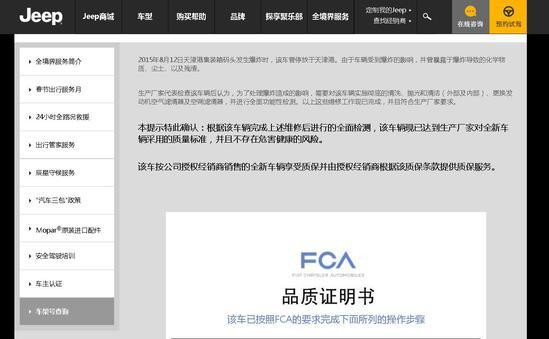 作为切诺基的生产厂家,美国克莱斯勒汽车公司又是如何解释的呢?在其官方网站上有一份《关于天津港受影响车辆处理方法的沟通函》。声明中明确提到“消费者在进店看车时,经销商会出具《重要提示》、《品质证明书》明确告知消费者该车辆的相关信息 ”。显然,4S店的作法不符合厂商要求。