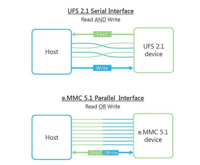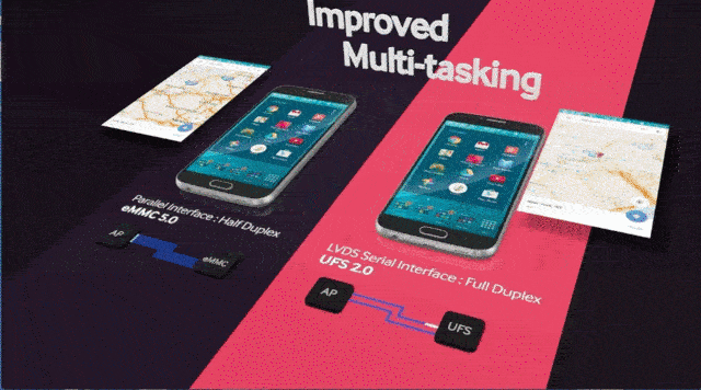 拥有UFS2.0接口手机,LVDS(低压差分信号)有专门串行接口,读写操作同时进行; CQ(命令)队列动态调配任务,无需等待上一进程结束。相反eMMC接口的手机读写必须分开执行,指令也是打包的,在速度上就已经是略逊一筹,在执行多任务时eMMC自然要慢一步。