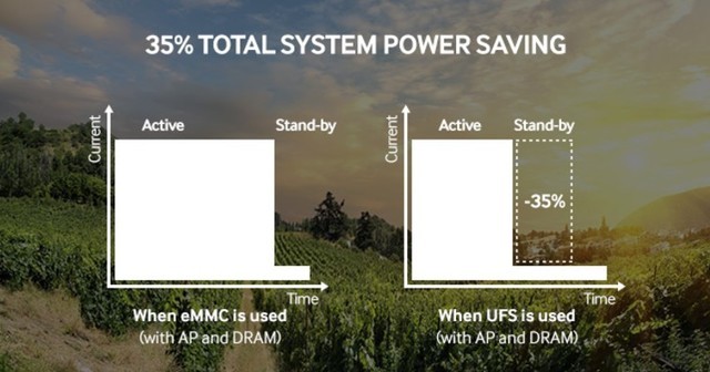 UFS接口在提升了速率之后,也就意味着在相同的任务面前它所花费的时间更短,更高的效率意味着更低的功耗。在同时工作的时候UFS的功耗要比eMMC低出10%,日常工作中大约能省35%的功耗,这对于目前的智能手机续航无疑是更好的选择。