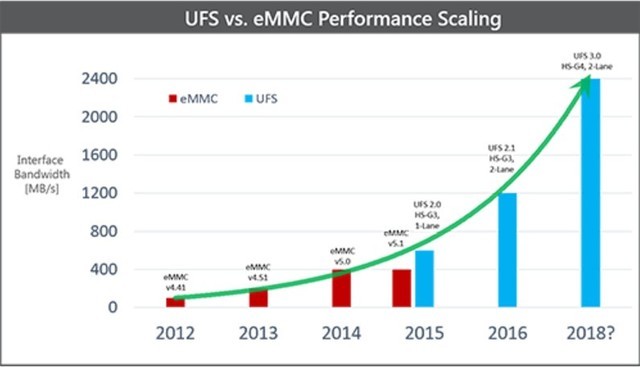 相比eMMC,JEDEC 发布了全新的USF 2.0 标准在接口速率上提升不少,全新的USF 2.0 有两个版本,其中UFS 2.0 HS-G2的理论带宽为5.8Gbps,大约740 MB/s,更快速的UFS 2.1 HS-G3的理论带宽更是达到了11.6Gbps,约1.5GB/s。