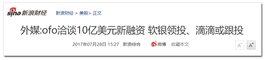 2017年中,ofo疯狂烧钱铺车和补贴,资金短缺,程维从日本拉来软银一笔10亿美元融资。